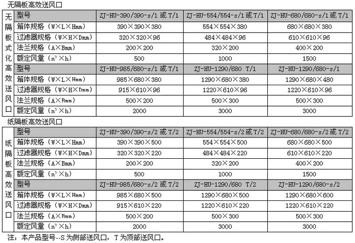 高效送風口有Ⅰ、Ⅱ兩種系列。系列Ⅰ為可更換過濾器形式,系列Ⅱ為一次性風口形式,均為下送風。