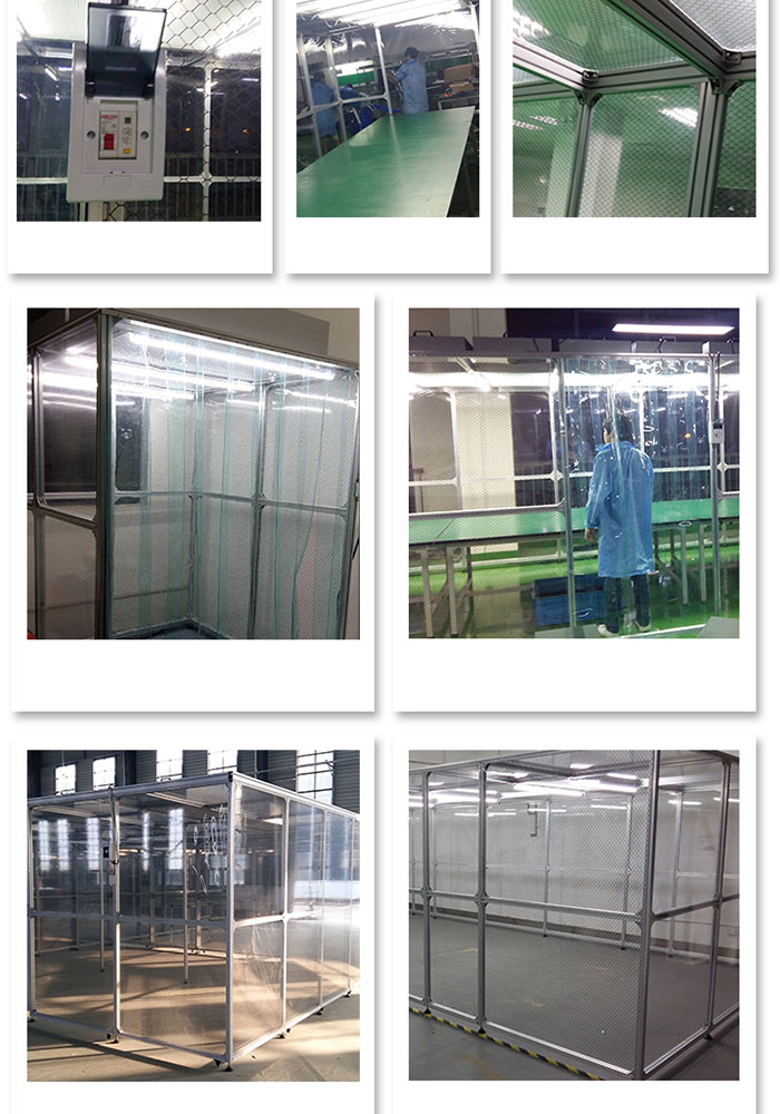 鐵方通烤漆,不銹鋼,陽極擠壓鋁管框架,2.0毫米可拆卸防靜電乙烯條FRT門簾乙烯基外殼和0.3mm防靜電窗簾。